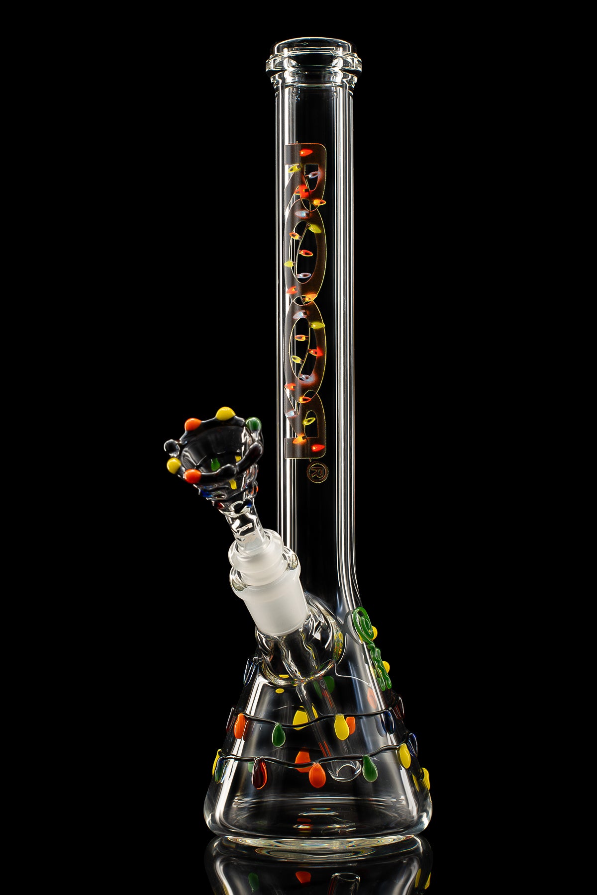 ROOR® Custom, Christmas *X-Mas Lights Beaker* 2025 featuring glass Christmas lights wrapped around the base and neck with matching bowl and decal.